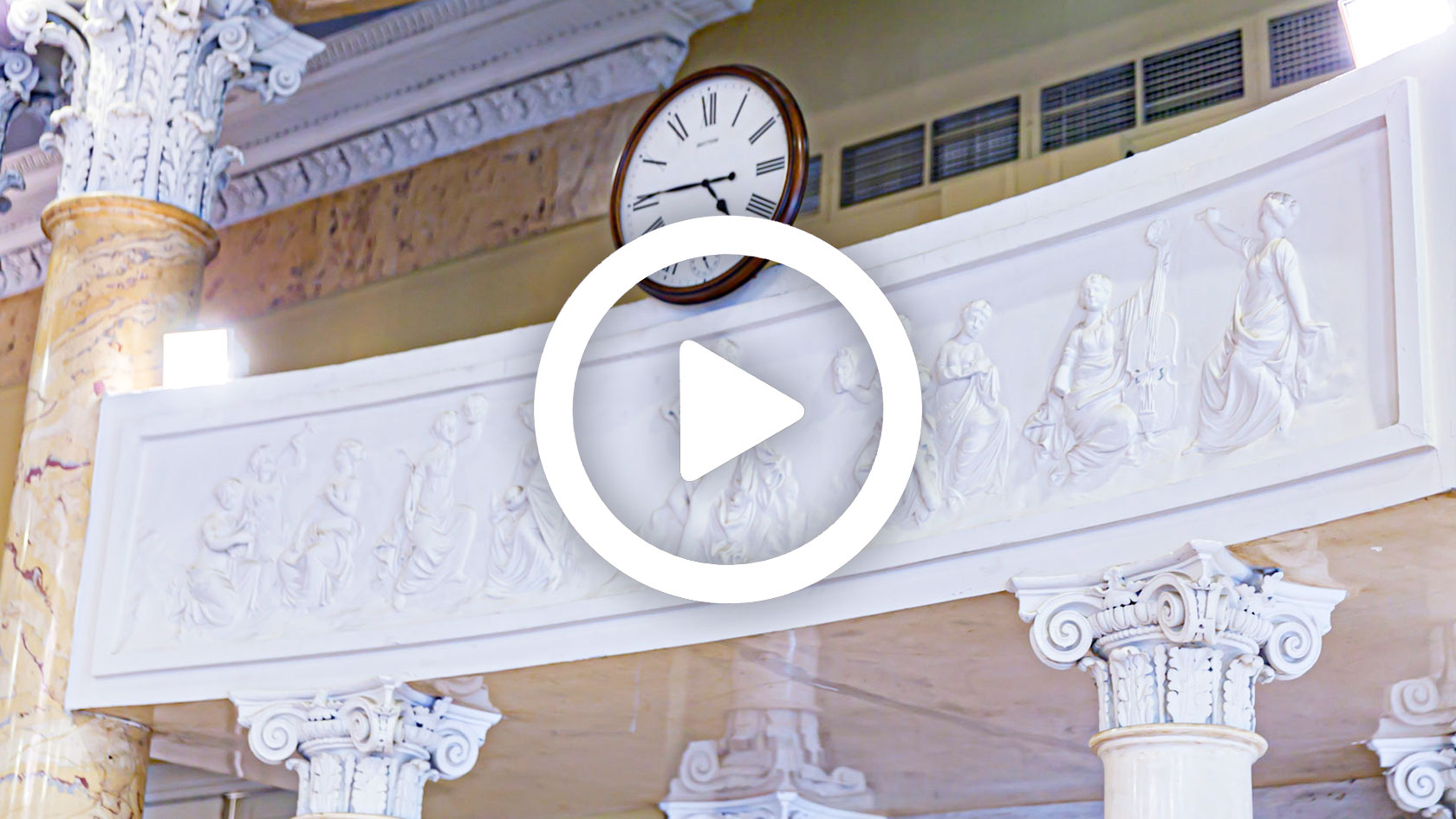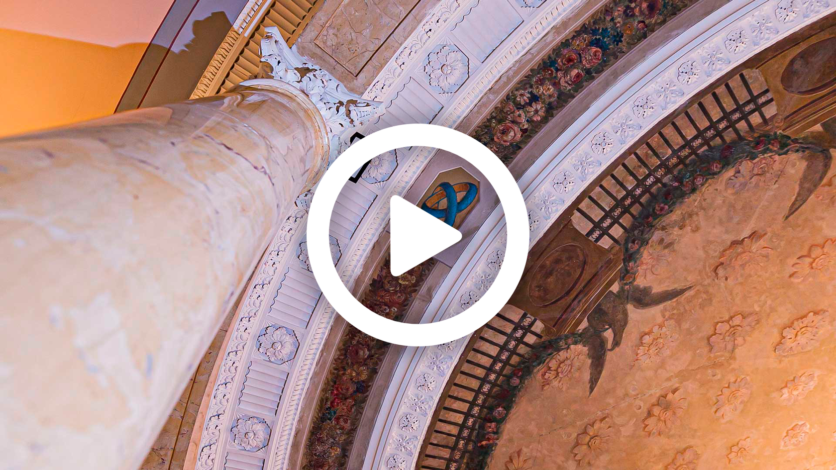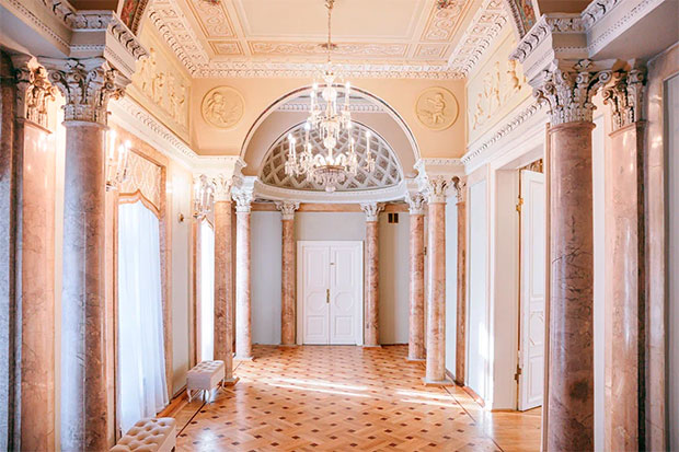 Строго-элегантному портику противопоставлен обычный жилой вход в левом флигеле. Входная дверь вела в парадный вестибюль, разделенный колоннами на две части. Расположенные полукругом, они плавно подводят к великолепной парадной лестнице. Если взглянуть наверх, можно увидеть огромные боковые окна и парные колонны. В основании лестницы – трехметровое зеркало, которое визуально удваивает пространство. Вечерами лестницу освещал живой огонь свечей настенных хрустальных подсвечников. По ступеням лестницы, покрытой ковром, гости поднимались в помещение, называемое аванзалом.